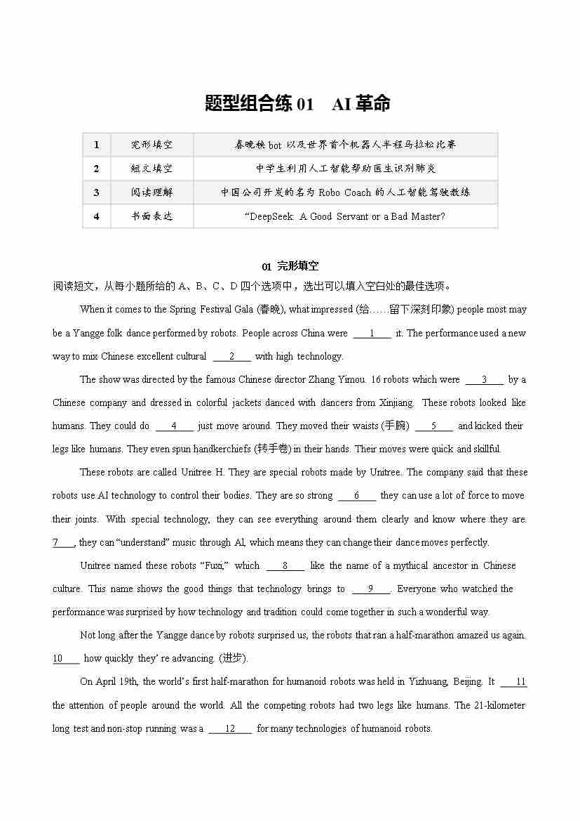 Part 4 必考题型组合练题型组合练01 AI革命(完形填空短文填空阅读单选书面表达)(培优综合训练)(全国通用)(解析版)