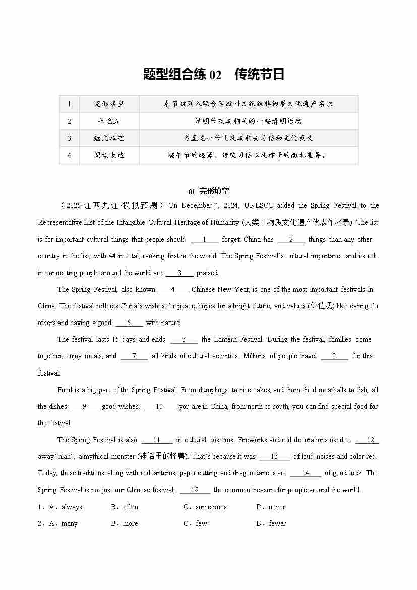 Part 4 必考题型组合练题型组合练02 传统节日(完形填空七选五短文填空阅读表达)(培优综合训练)(全国通用)(原卷版)