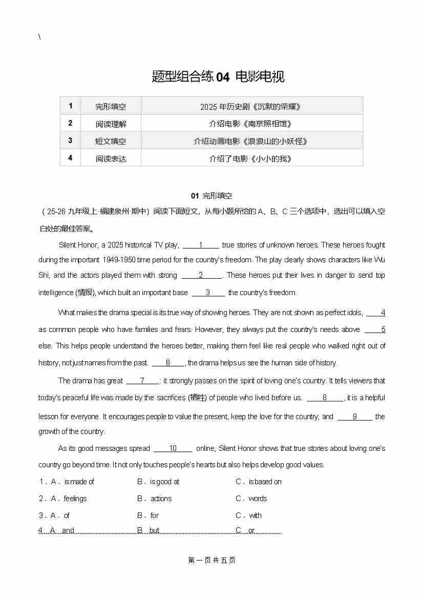 Part 4 必考题型组合练题型组合练04 电影电视(完形填空阅读理解短文填空阅读表达)(培优综合训练)(全国通用)(原卷版)
