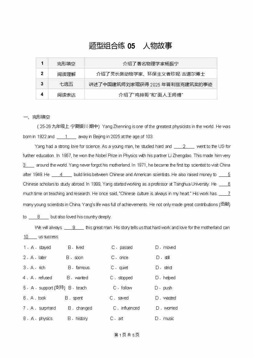 Part 4 必考题型组合练题型组合练05 人物故事(培优综合训练)(全国通用)(原卷版)