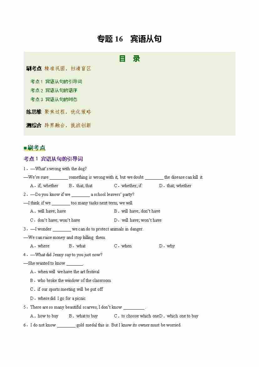 Part 1 核心语法精讲专题专题16 宾语从句(培优专练)(全国通用)(原卷版)