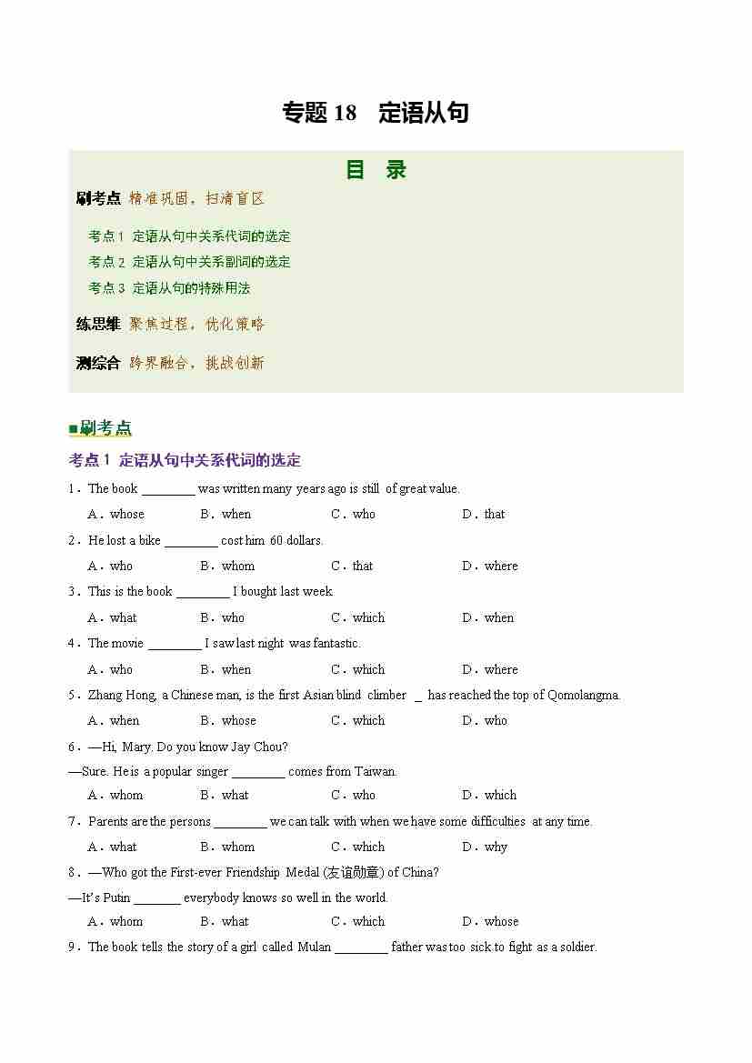 Part 1 核心语法精讲专题专题18 定语从句(培优专练)(全国通用)(原卷版)