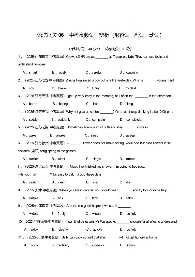 Part 3 词汇语法综合练语法闯关06 中考高频词汇辨析(形容词、副词、动词)(培优综合训练)(全国通用)(原卷版)1