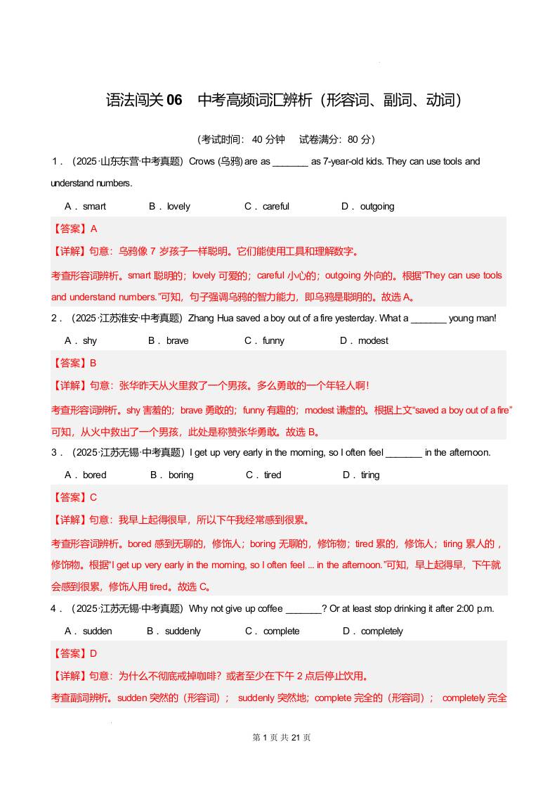 Part 3 词汇语法综合练语法闯关06 中考高频词汇辨析(形容词、副词、动词)(培优综合训练)(全国通用)(解析版)1