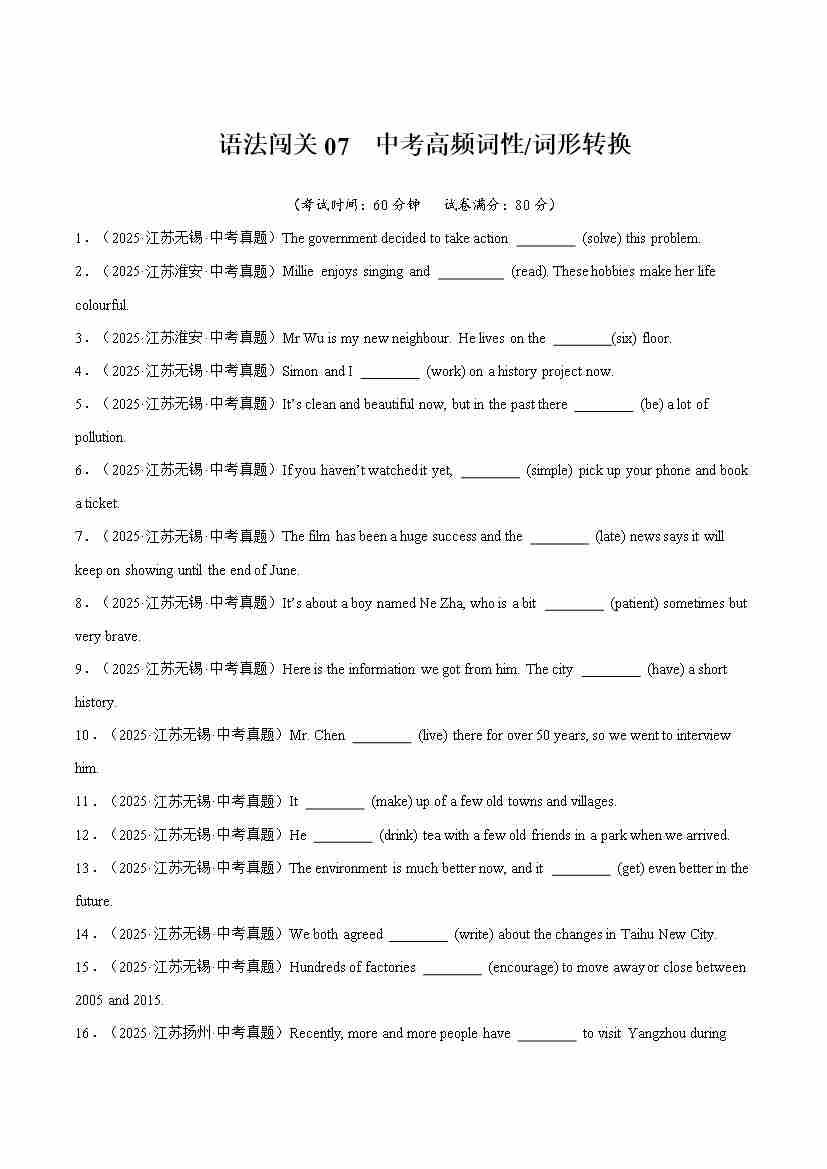 Part 3 词汇语法综合练语法闯关语法闯关07 中考高频词性(词形)转换(培优综合训练)(全国通用)(原卷版)