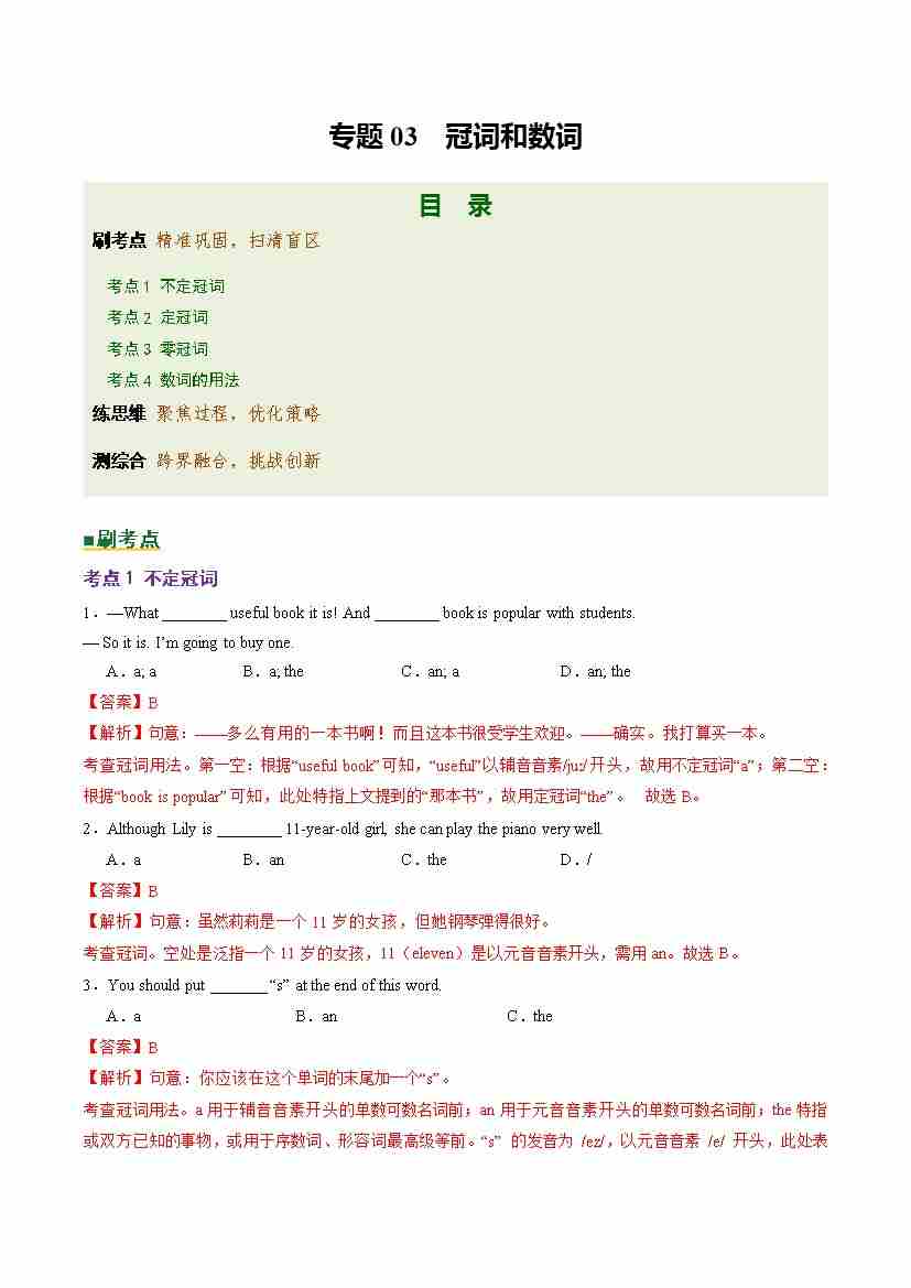 Part 1 核心语法精讲专题03 冠词和数词(培优专练)(全国通用)(解析版)