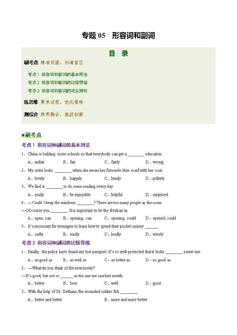 Part 1 核心语法精讲专题05 形容词和副词(培优专练)(全国通用)(原卷版)