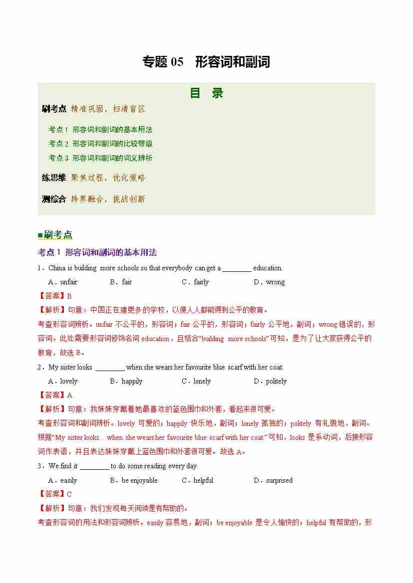 Part 1 核心语法精讲专题05 形容词和副词(培优专练)(全国通用)(解析版)