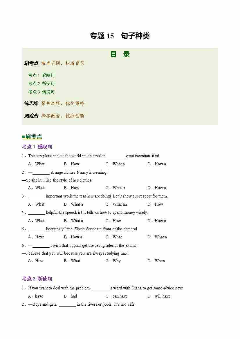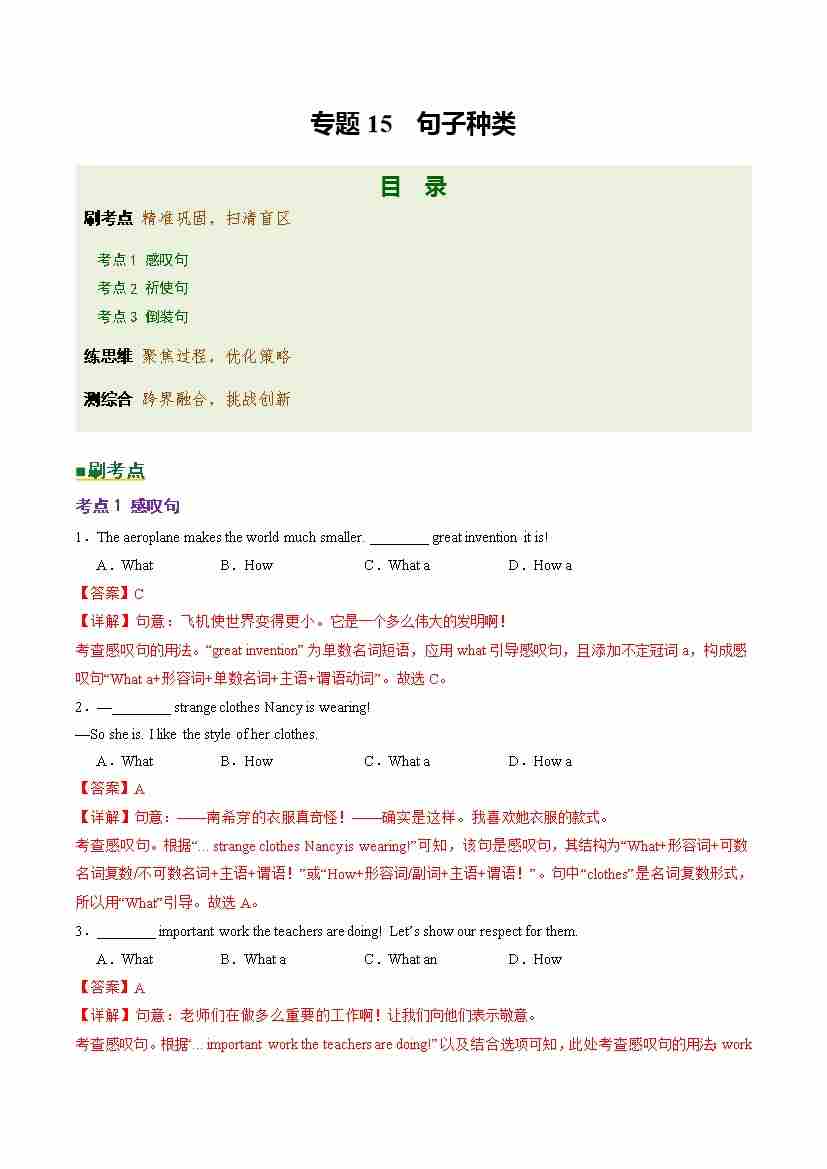 Part 1 核心语法精讲专题专题15 句子种类(培优专练)(全国通用)(解析版)