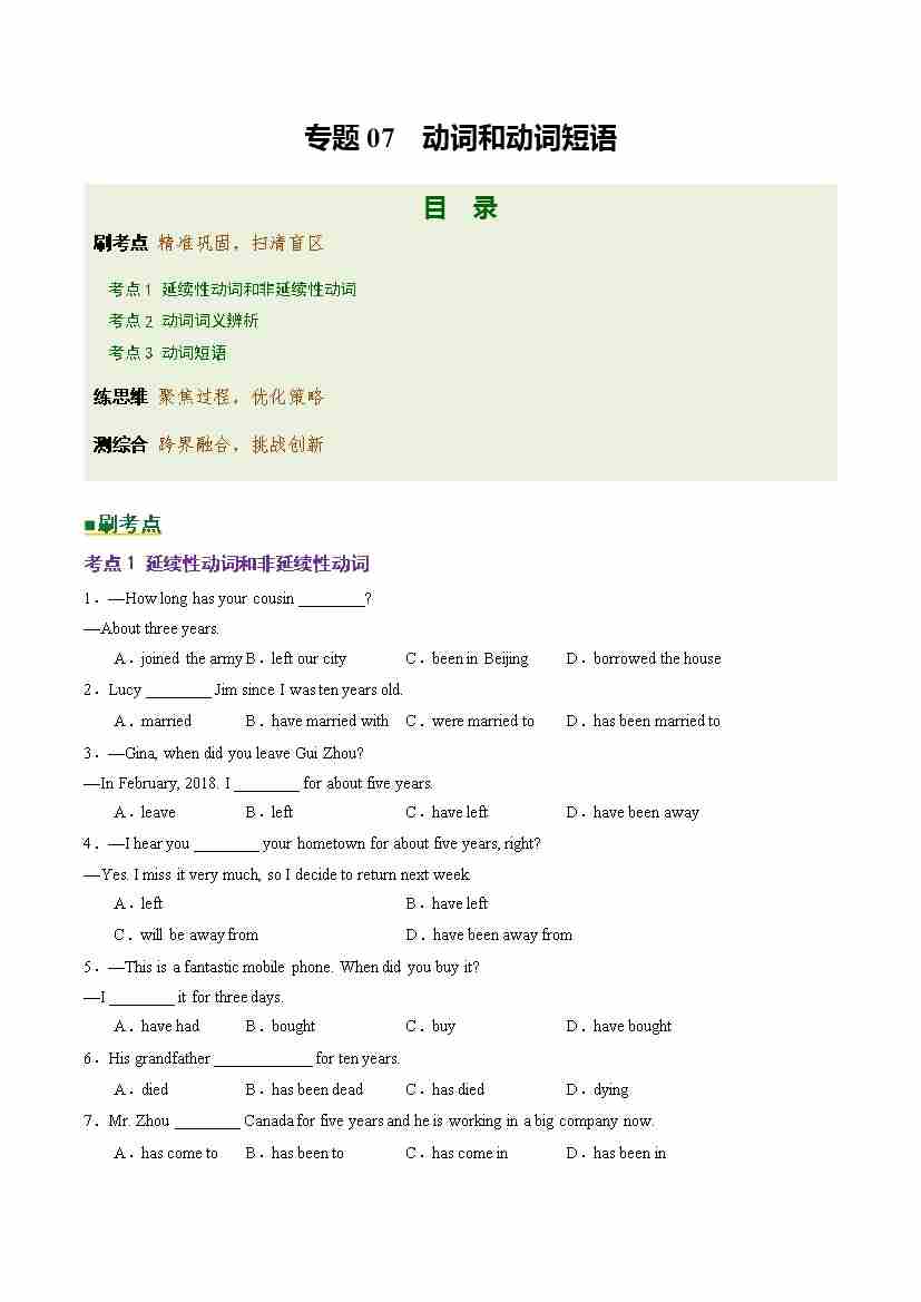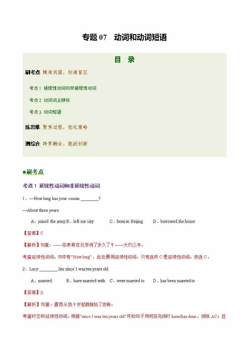 Part 1 核心语法精讲专题07 动词和动词短语(培优专练)(全国通用)(解析版)