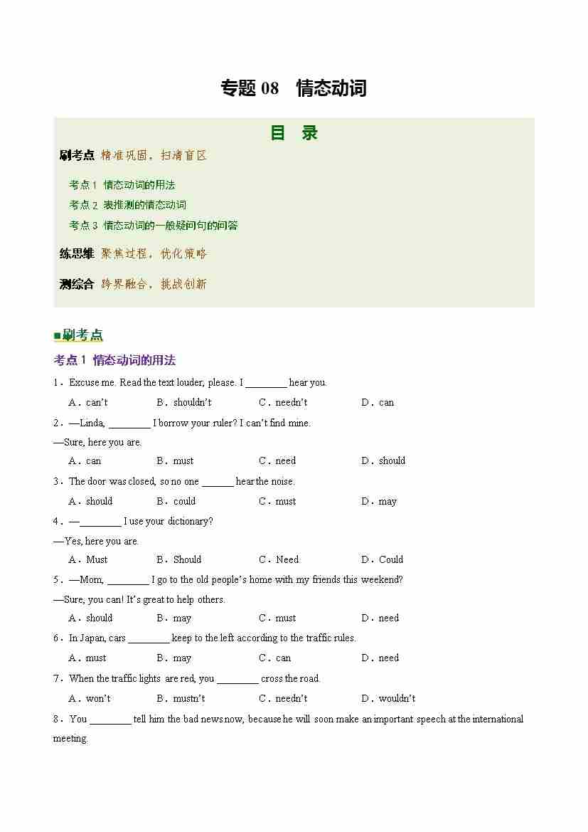 Part 1 核心语法精讲专题08 情态动词(培优专练)(全国通用)(原卷版)