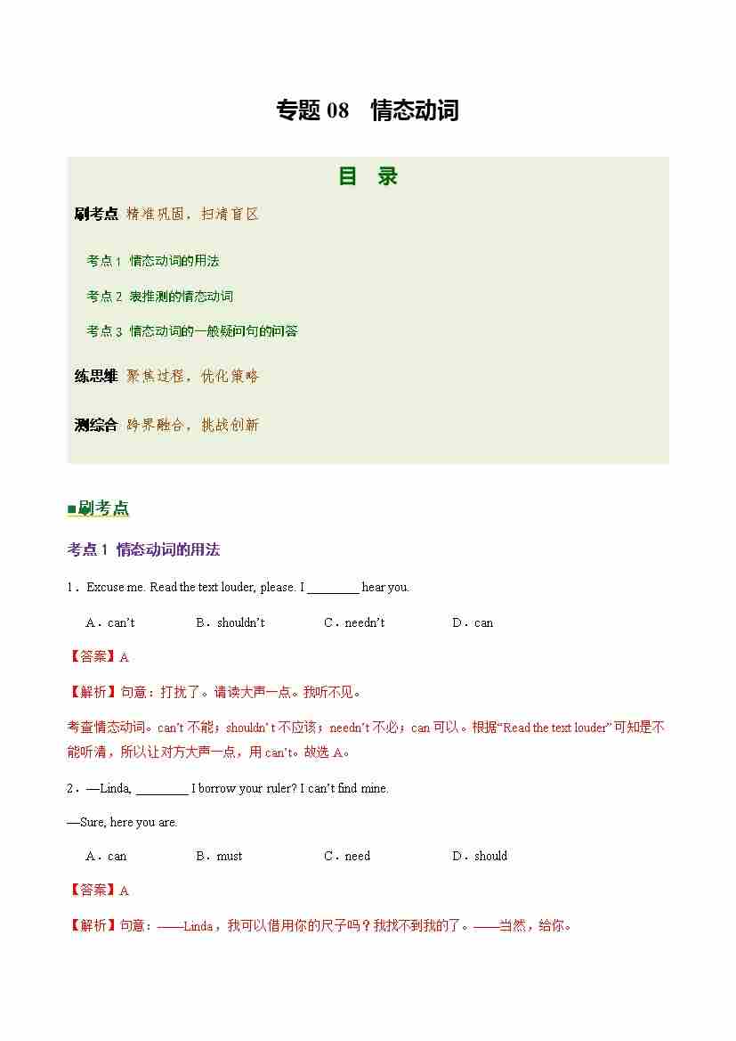 Part 1 核心语法精讲专题08 情态动词(培优专练)(全国通用)(解析版)