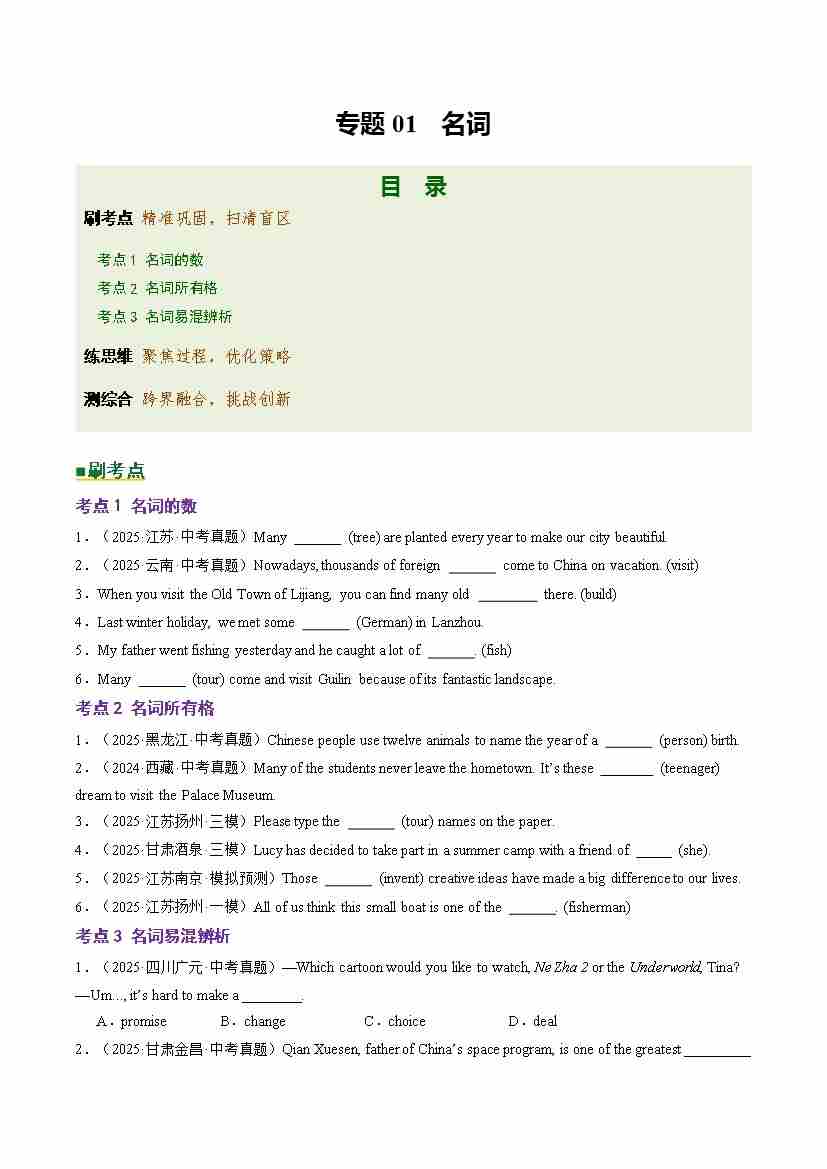 Part 1 核心语法精讲专题01 名词(培优专练)(全国通用)(原卷版)