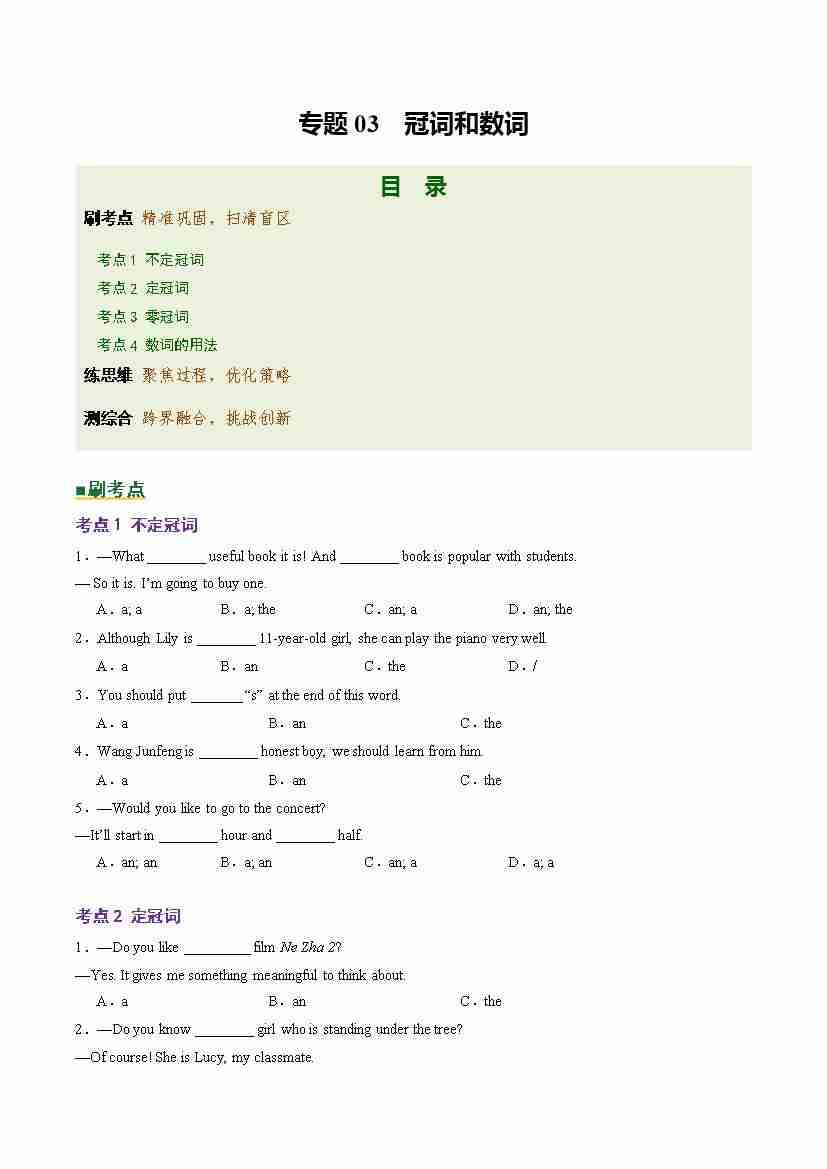 Part 1 核心语法精讲专题03 冠词和数词(培优专练)(全国通用)(原卷版)