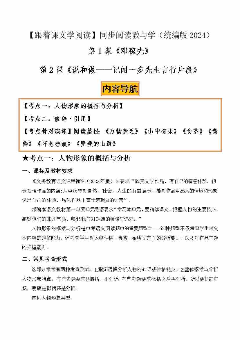 杨振宁《邓稼先》臧克家《说和做》:人物形象、引用修辞(解析版)