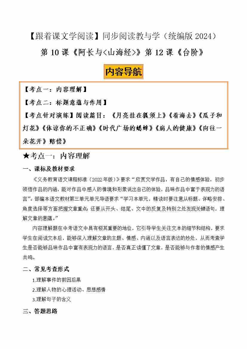 鲁迅《阿长与山海经》李森祥《台阶》:内容理解、标题含义(原卷版)