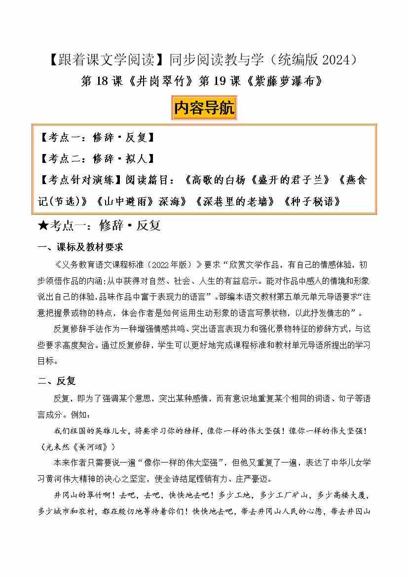袁鹰《井冈翠竹》宗璞《紫藤萝瀑布》:反复修辞、拟人修辞(解析版)