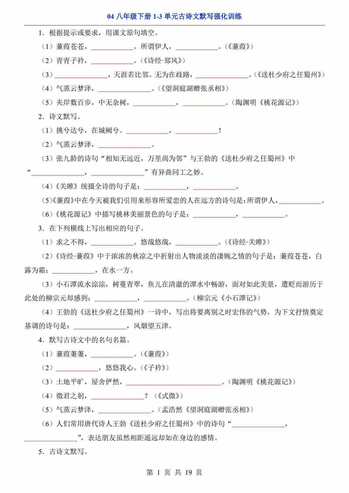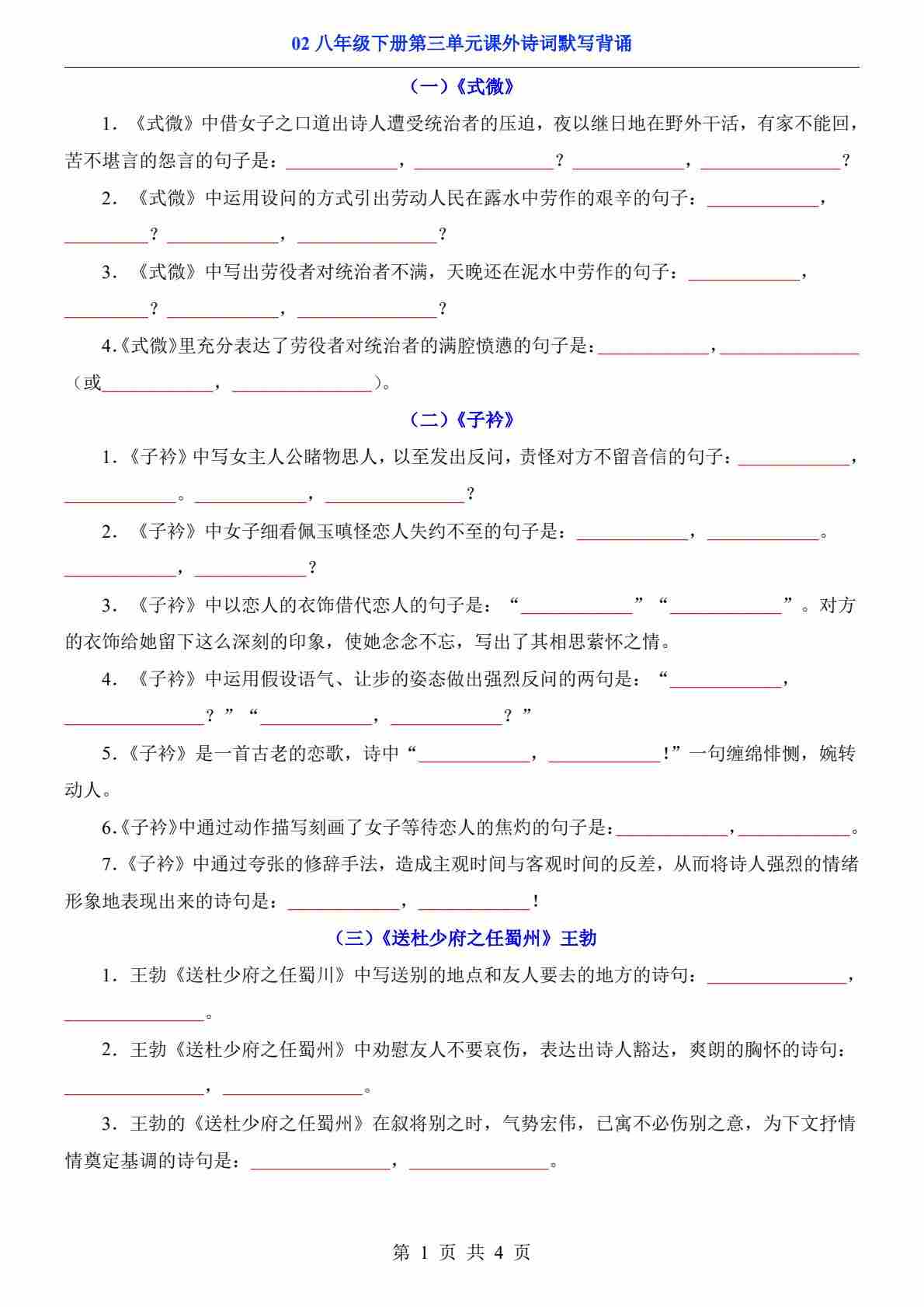 八年级(下)语文04 第1-3单元古诗文默写背诵