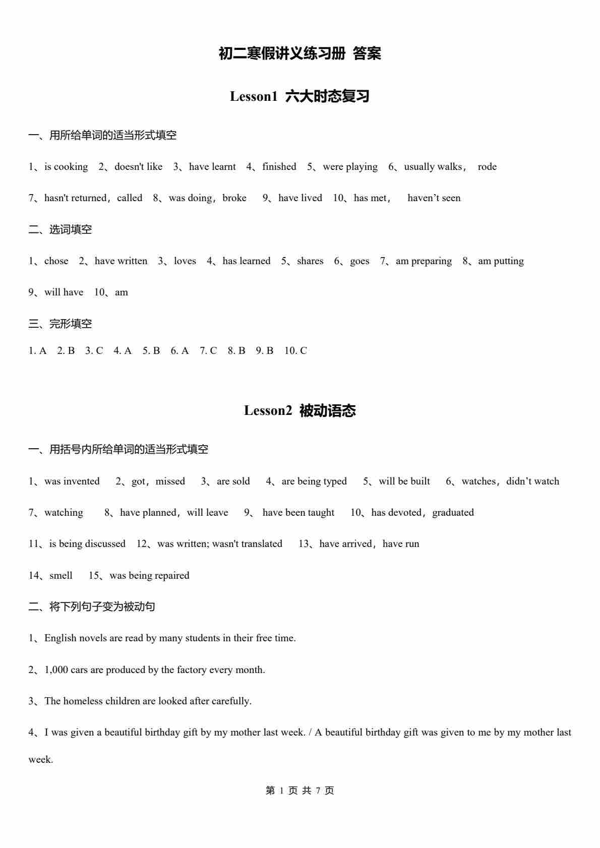 2026年初二寒假讲义练习册(答案)