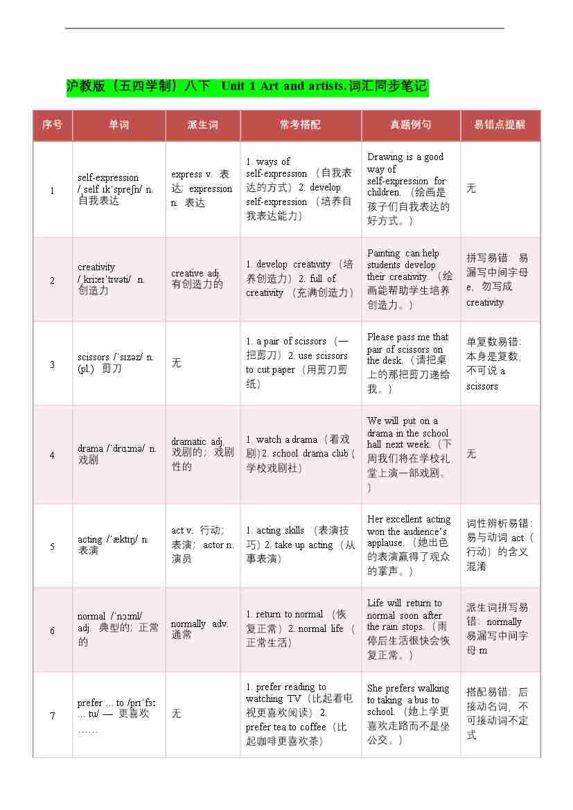 2026年春沪教版(五四学制)八下 Unit 1 Art and artists.词汇同步笔记(学案)