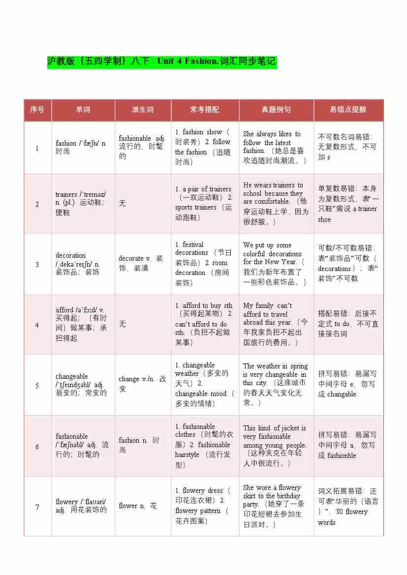 2026年春沪教版(五四学制)八下 Unit 4 Fashion.词汇同步笔记(学案)