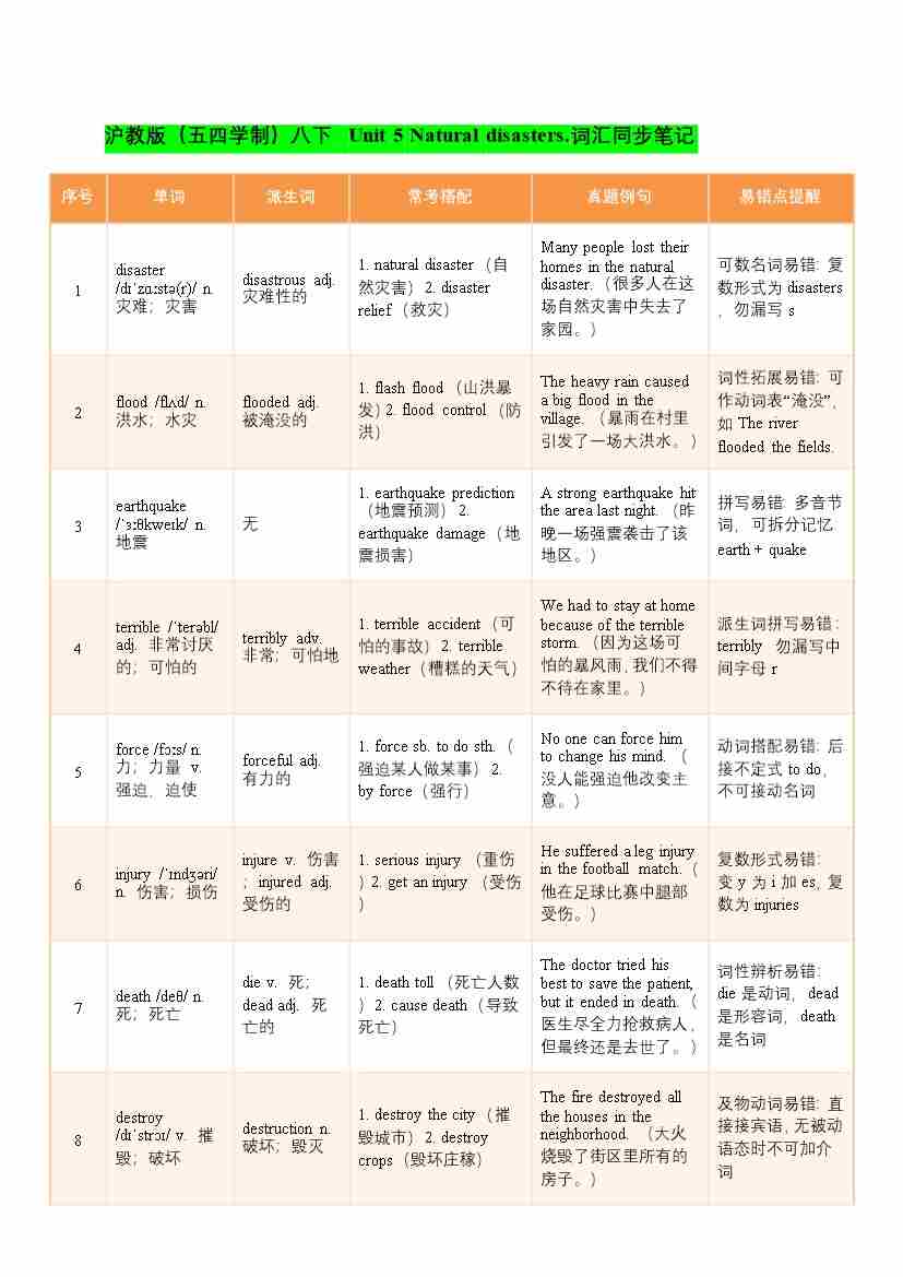 2026年春沪教版(五四学制)八下 Unit 5 Natural disasters.词汇同步笔记(学案)