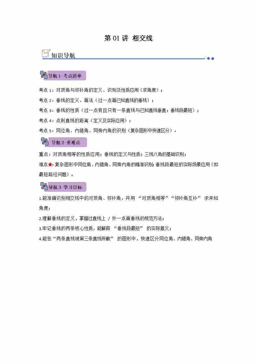 第01讲 相交线(知识解读例题精讲随堂检测)(原卷版)
