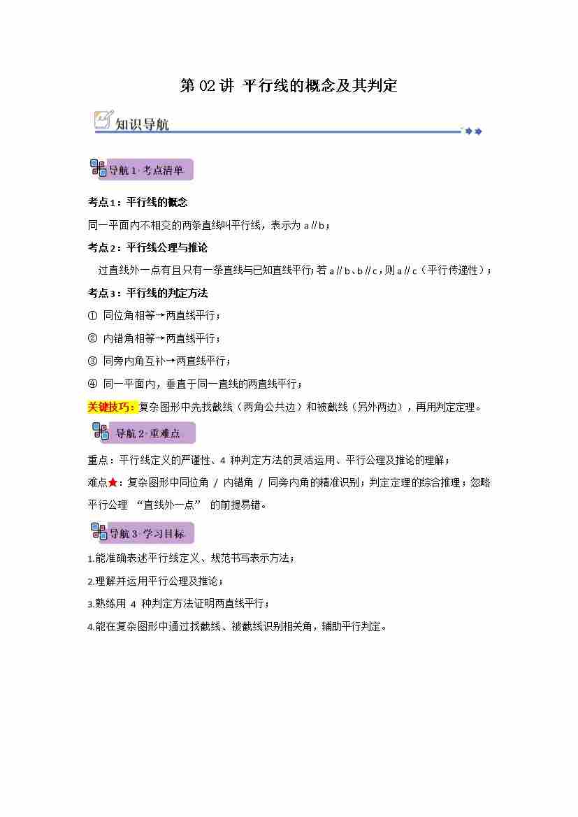 第02讲 平行线的概念及其判定(知识解读例题精讲随堂检测)(原卷版)