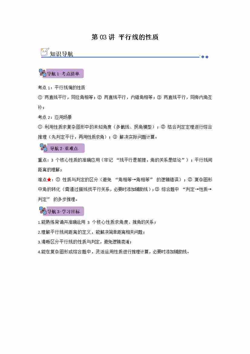 第03讲 平行线的性质(知识解读例题精讲随堂检测)(原卷版)