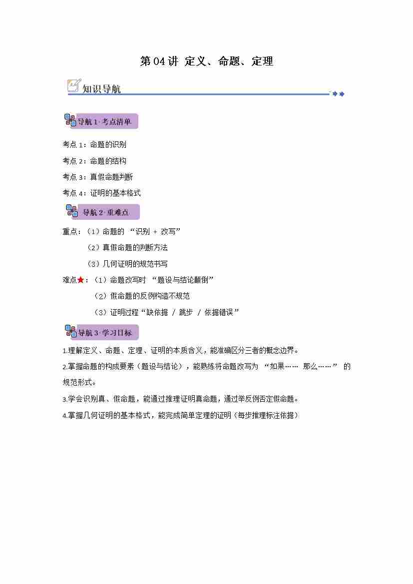 第04讲 定义﹑命题﹑定理(知识解读例题精讲随堂检测)(原卷版)