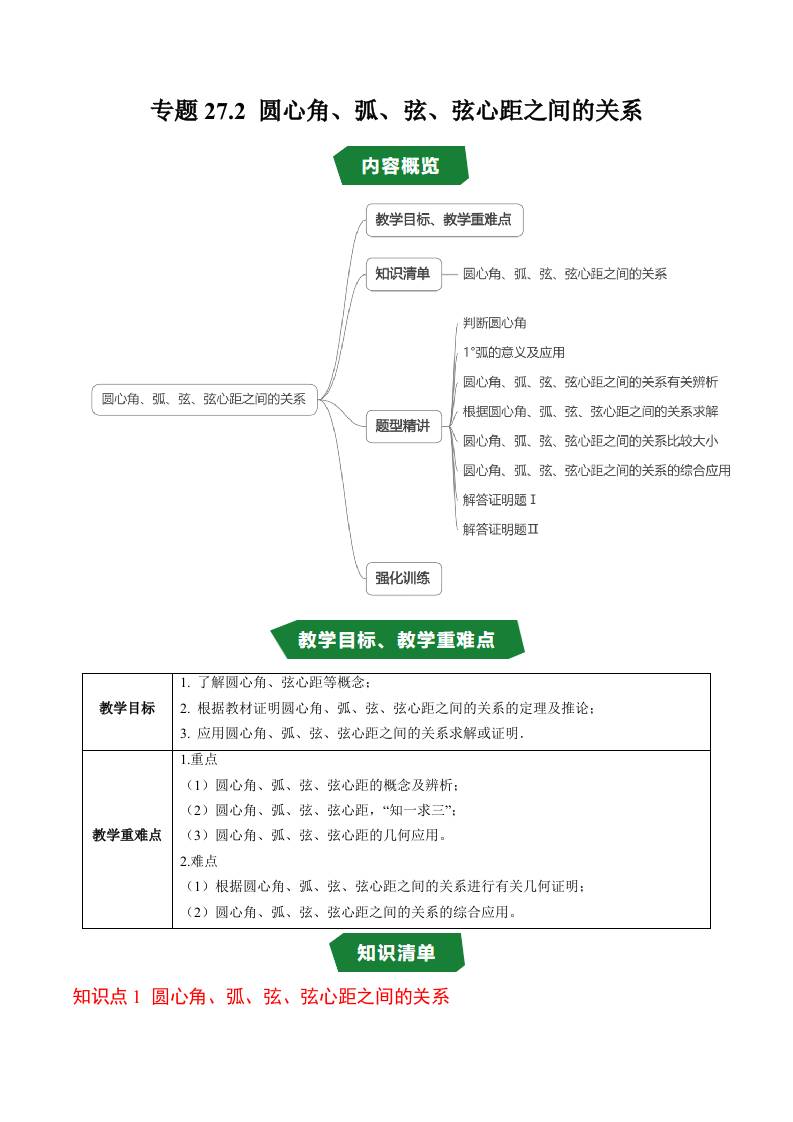 专题27.2 圆心角、弧、弦、弦心距之间的关系(高效培优讲义)(原卷版)