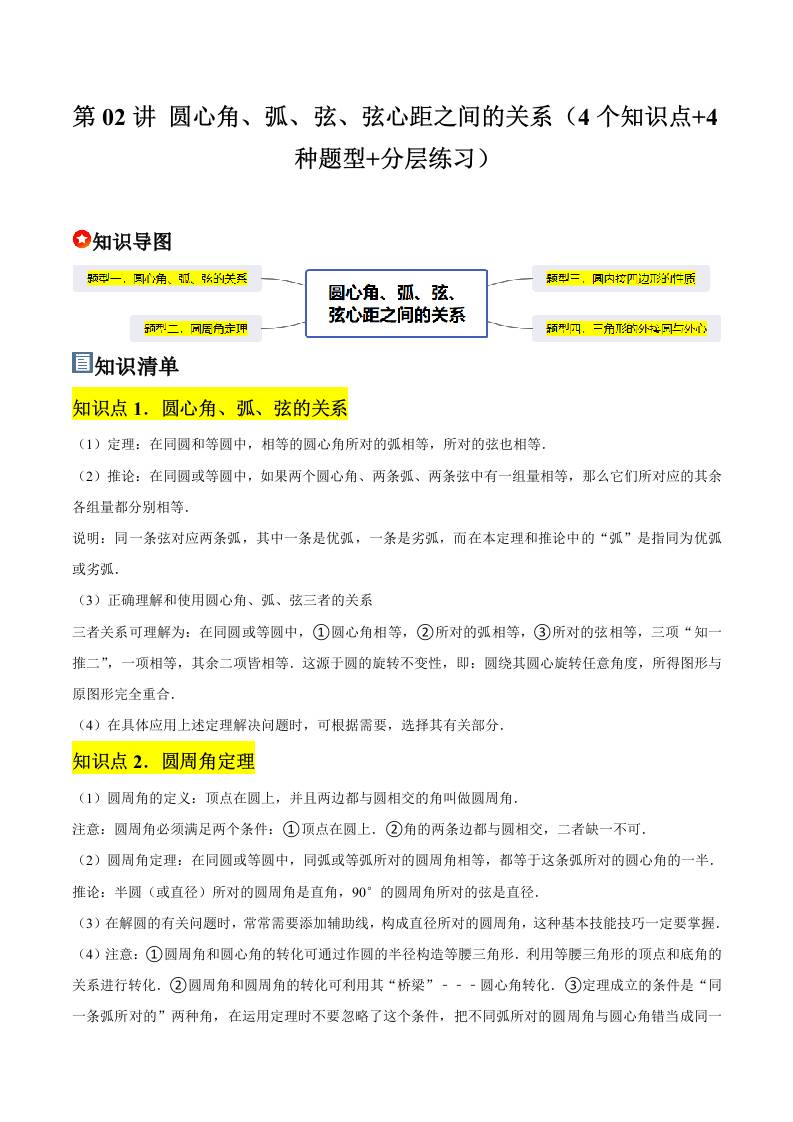 第02讲 圆心角、弧、弦、弦心距之间的关系(4个知识点4种题型分层练习)(学生版)