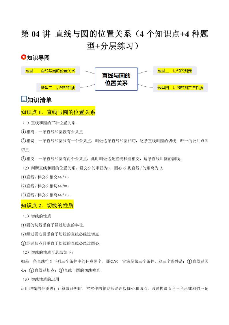第04讲 直线与圆的位置关系(4个知识点4种题型分层练习)(学生版)