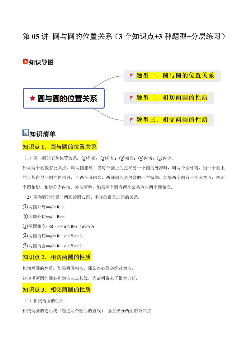 第05讲 圆与圆的位置关系(3个知识点3种题型分层练习)(学生版)