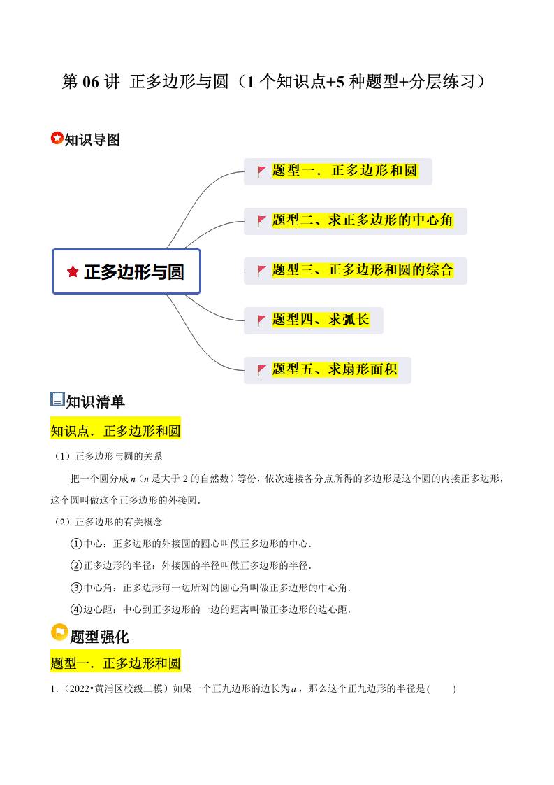 第06讲 正多边形与圆(1个知识点7种题型分层练习)(学生版)