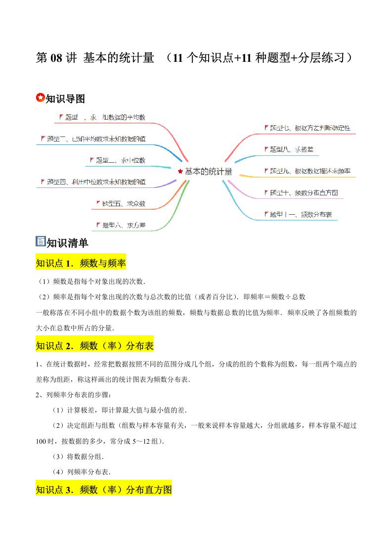 第08讲 基本的统计量 (11个知识点11种题型分层练习)(学生版)