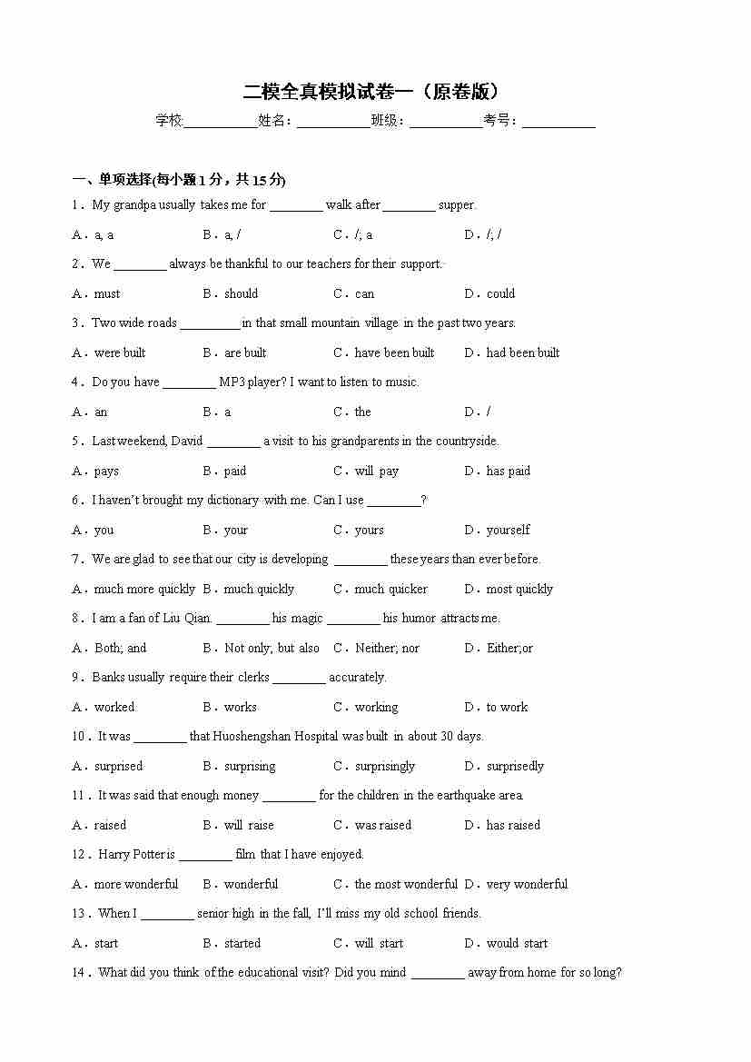 二模全真模拟试卷01(原卷版)-【寒假自学课】九年级英语寒假精品课(二模)(牛津上海版)