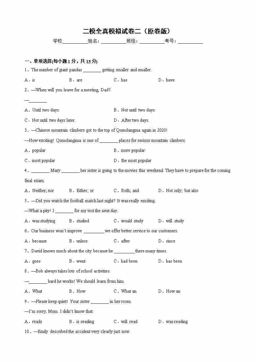 二模全真模拟试卷02(原卷版)-【寒假自学课】九年级英语寒假精品课(二模)(牛津上海版)