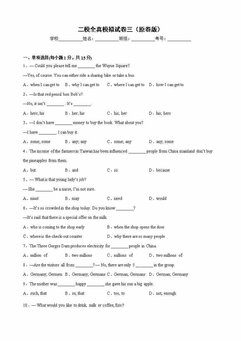 二模全真模拟试卷03(原卷版)-【寒假自学课】九年级英语寒假精品课(二模)(牛津上海版)