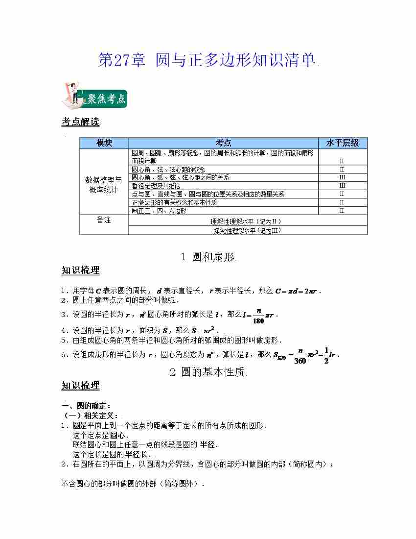 第27章 圆与正多边形(知识清单)(沪教版)