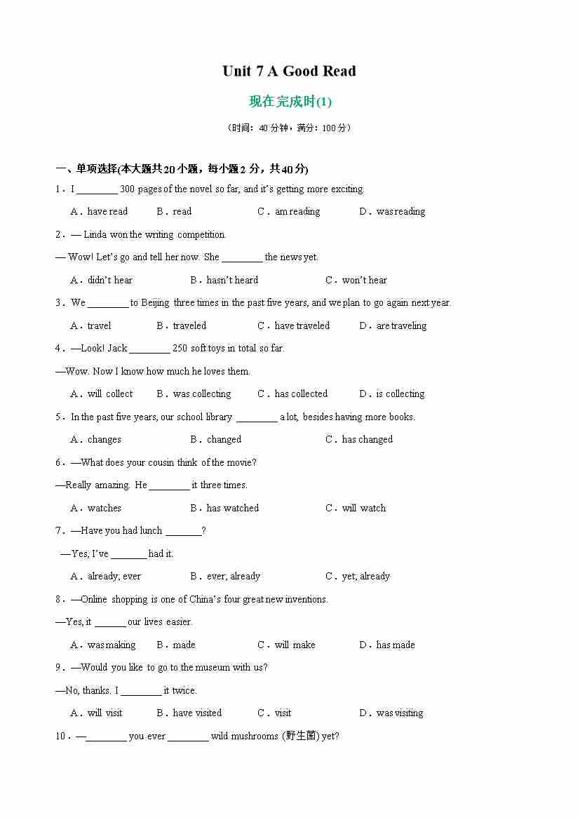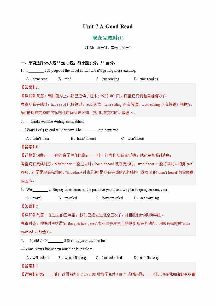 Unit 7 A Good Read 单元语法(现在完成时)(解析版)