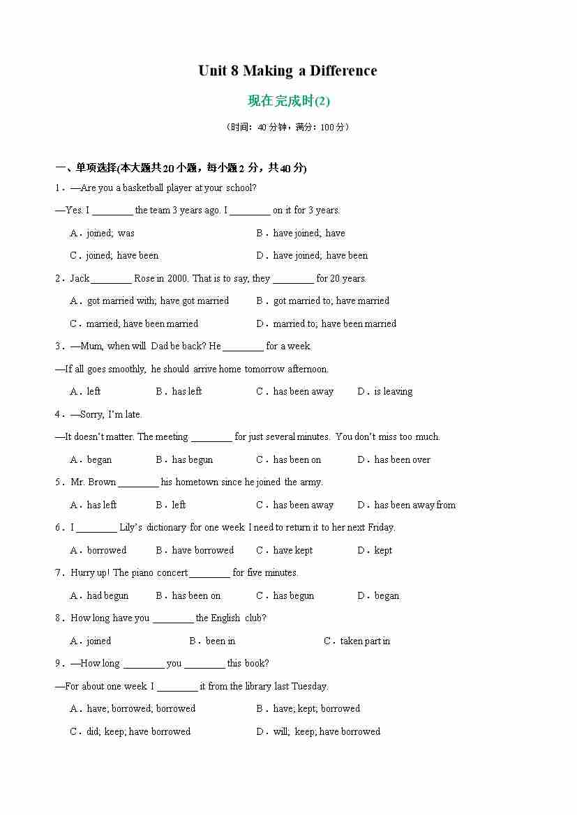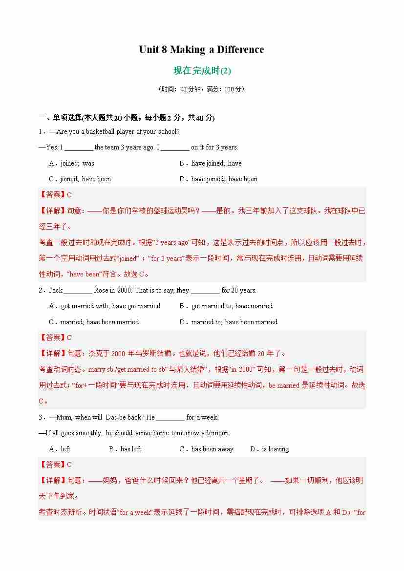 Unit 8 Making a Difference 单元语法(现在完成时)(解析版)