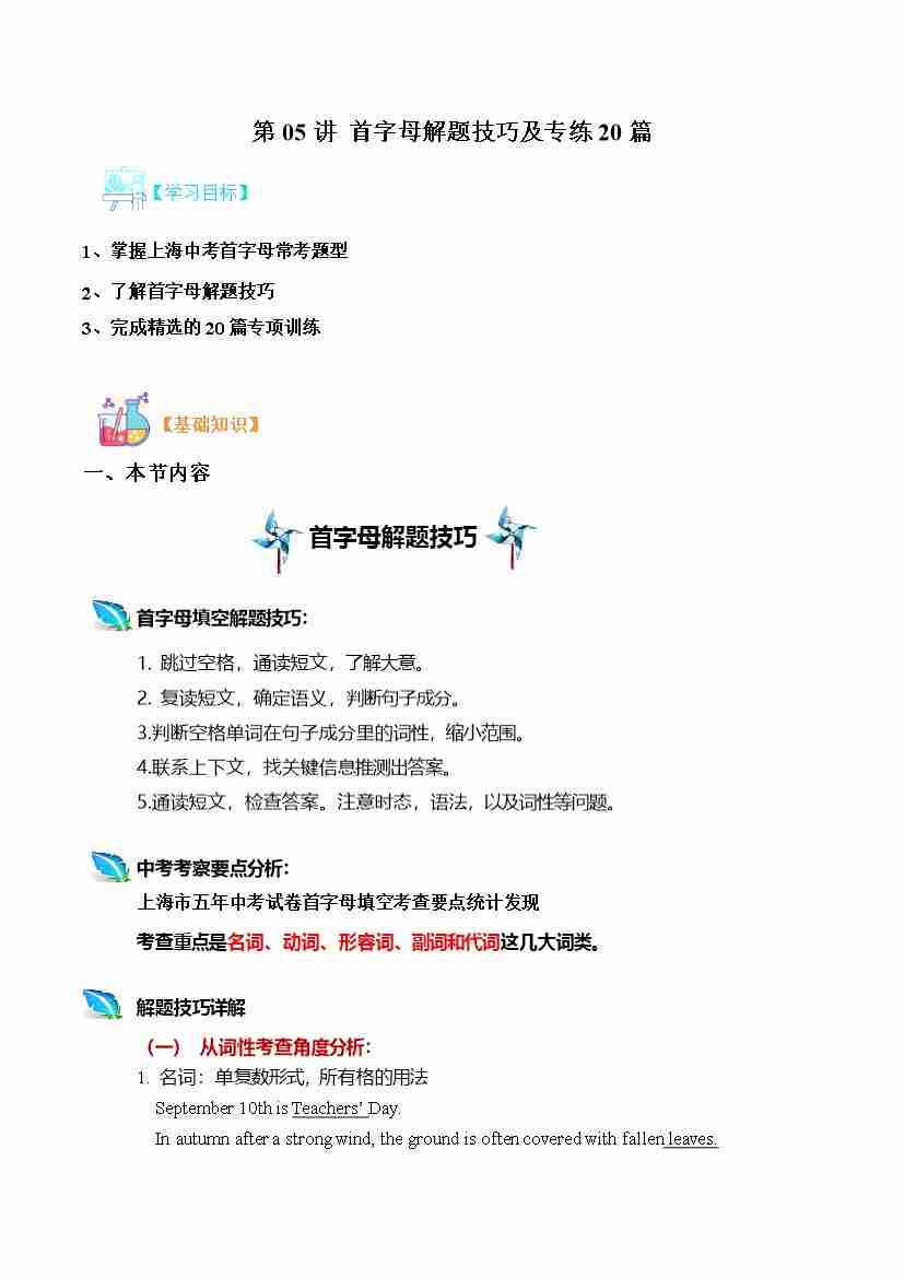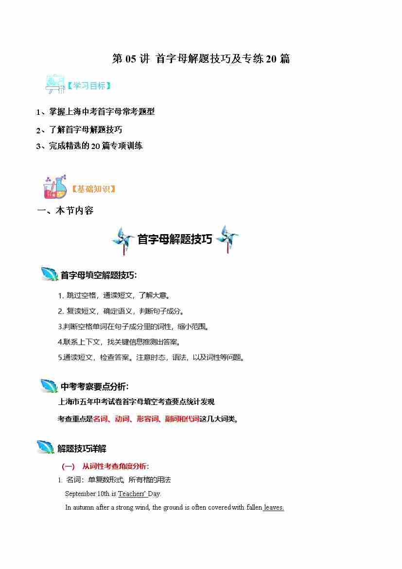 第05讲 首字母解题技巧及专练20篇(原卷版)-【寒假自学课】九年级英语寒假精品课(二模)(牛津上海版)