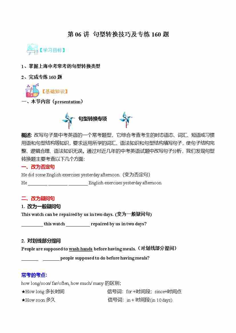 第06讲 句型转换技巧及专练160题(原卷版)-【寒假自学课】九年级英语寒假精品课(二模)(牛津上海版)