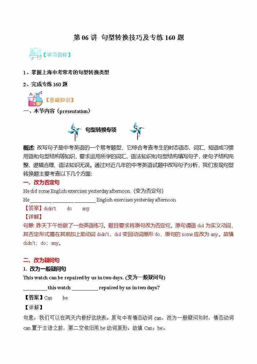 第06讲 句型转换技巧及专练160题(解析版)-【寒假自学课】九年级英语寒假精品课(二模)(牛津上海版)