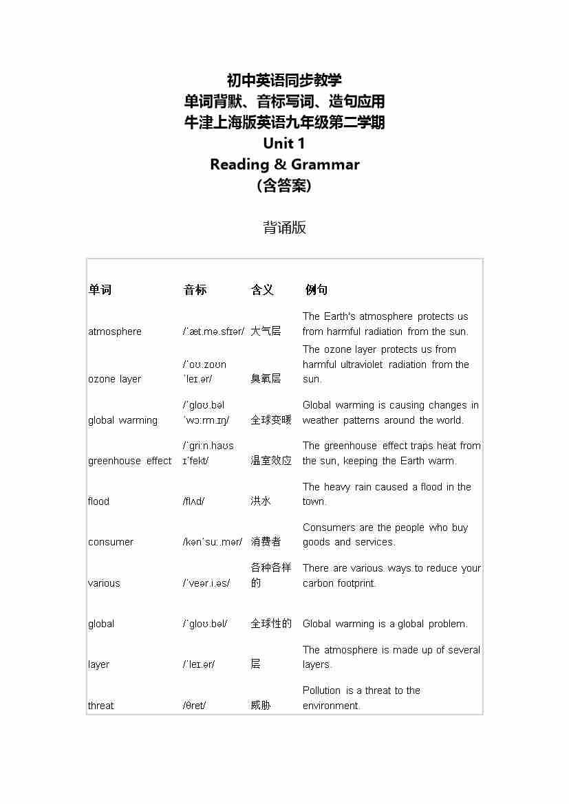 Unit 1 Reading & Grammar 单词背默音标写词造句应用同步练习