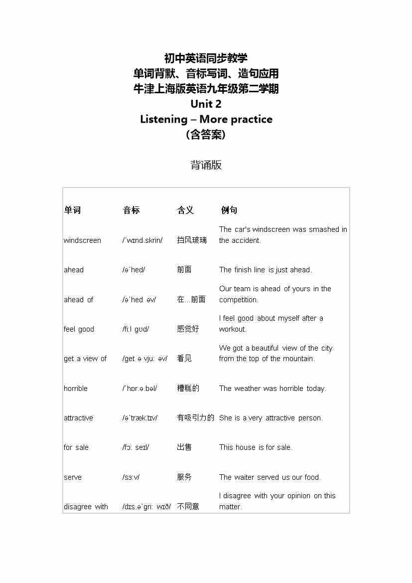 Unit 2 Listening ~More Practice单词背默音标写词造句应用同步练习
