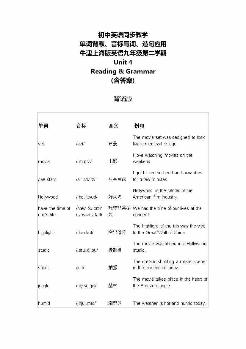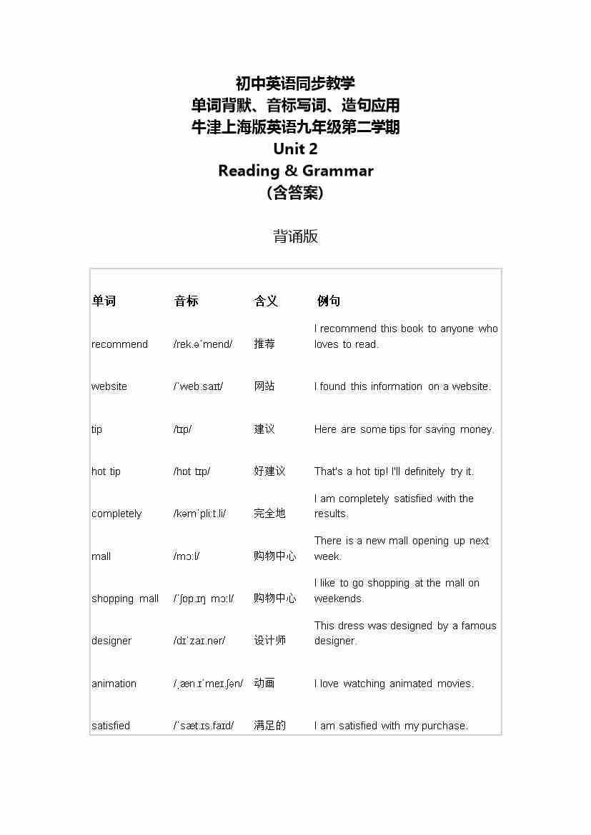 Unit 2 Reading & Grammar 单词背默音标写词造句应用同步练习