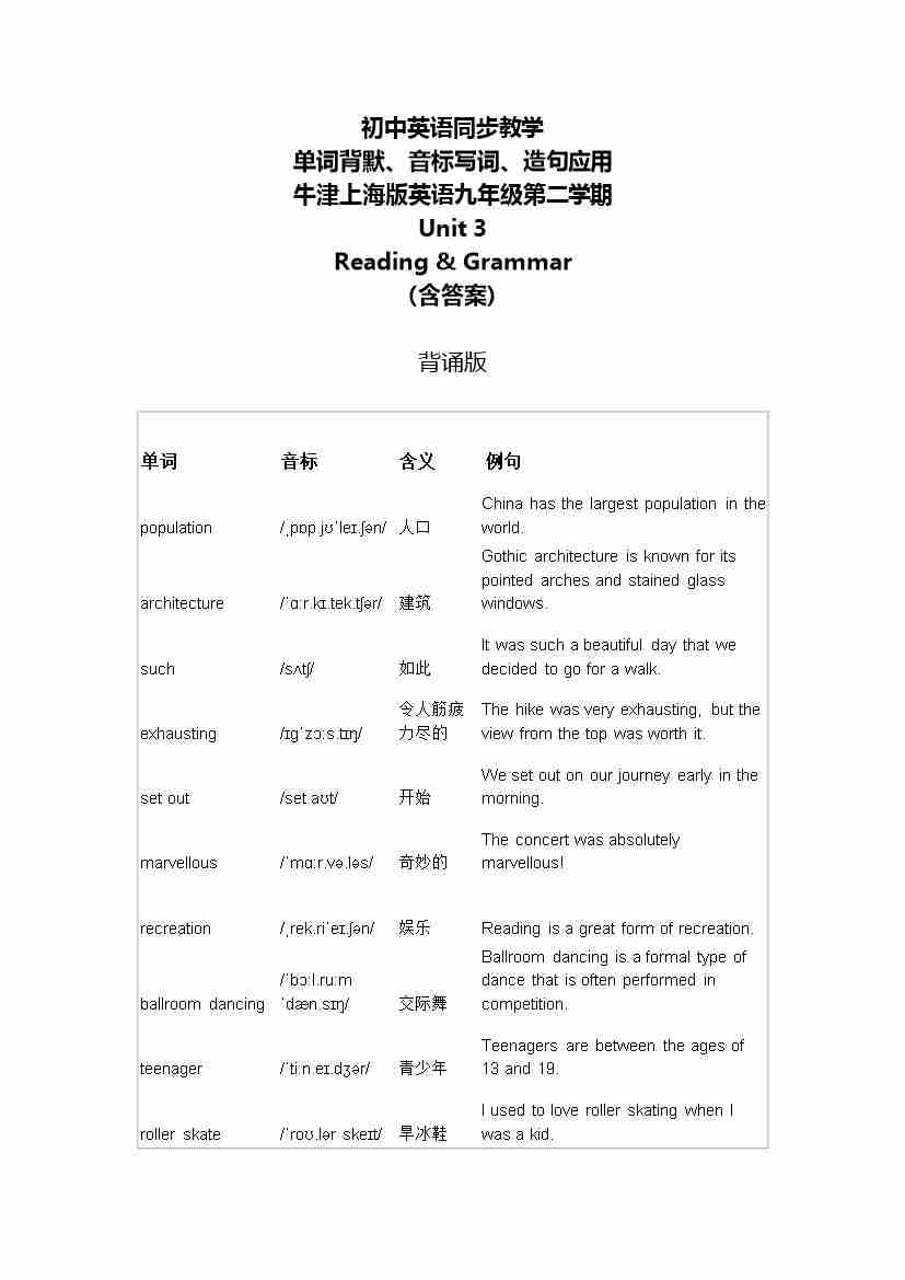 Unit 3 Reading & Grammar 单词背默音标写词造句应用同步练习