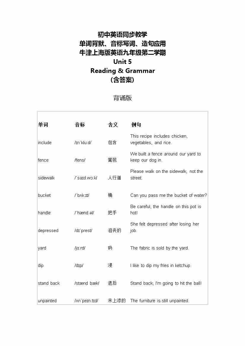 Unit 5 Reading & Grammar 单词背默音标写词造句应用同步练习